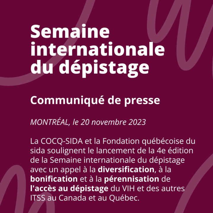 La Semaine internationale du dépistage (20-26 novembre) est l’occasion pour les membres de Coalition PLUS de se mobiliser d’une même voix pour mettre en lumière l’importance du dépistage. En effet, il s’agit de la porte d’entrée aux soins contre le VIH, et donc vers la fin de l’épidémie.
